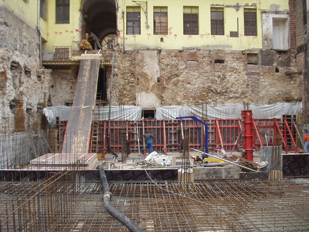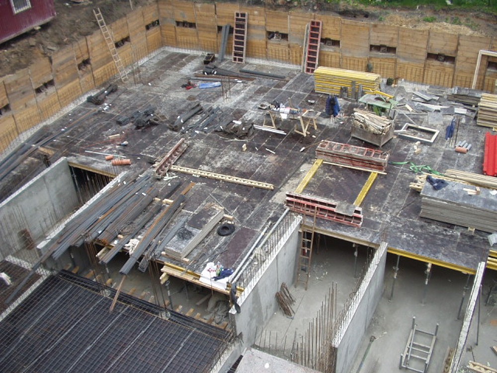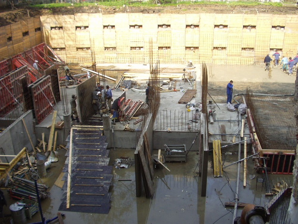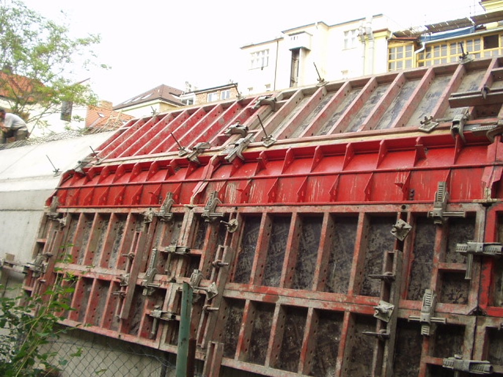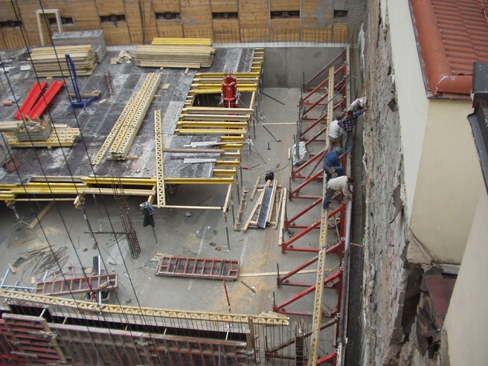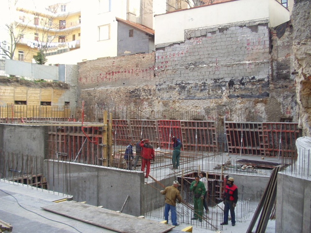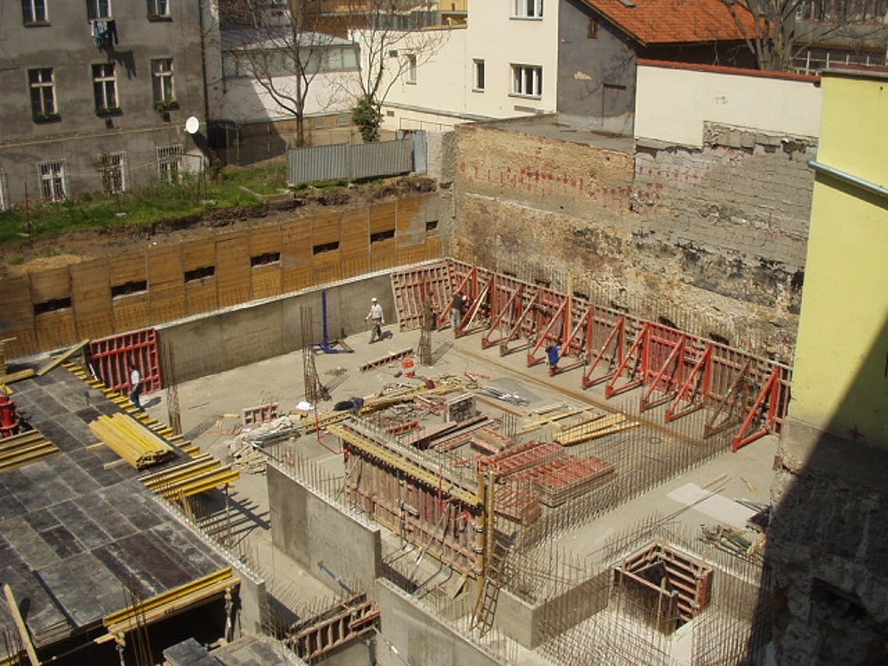 4. podlažní kombinovaný stěno-sloupový skelet podzemních garáží ve vnitrobloku s bazénem na střeše |